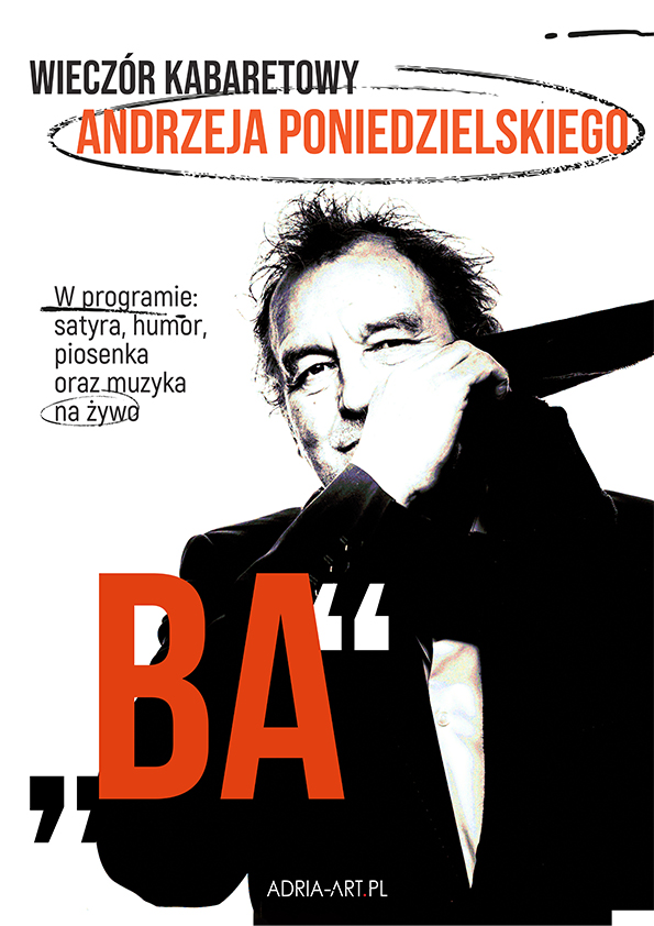 Koncert jubileuszowy Andrzeja Poniedzielskiego, który promuje najnowszą płytę artysty, zatytułowaną „BA”. Podczas pełnego humoru wieczoru kabaretowego usłyszymy piosenki nie tylko z najnowszej płyty, ale też wiele innych i dużo inteligentnej satyry w wykonaniu mistrza.
